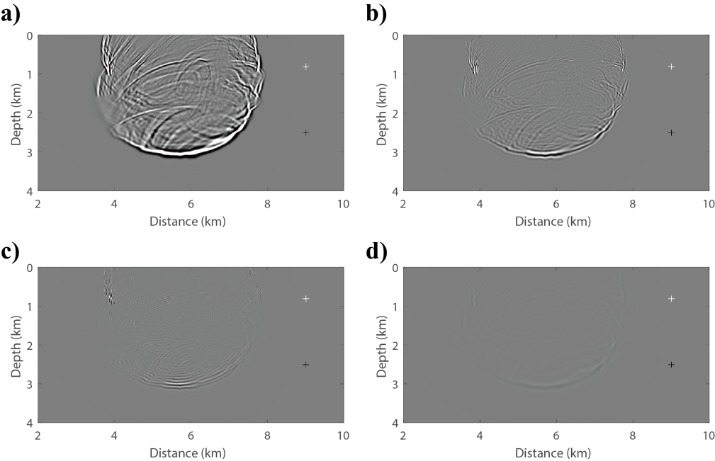 图3 Marmousi 模型中的波场快照对比。(a)空间隐式-时间4阶差分格式的结果;(b-d)分别为图a与空间显式8阶-时间2阶差分格式、空间显式8阶-时间4阶差分格式以及空间显式64阶-时间4阶差分格式的波场差异