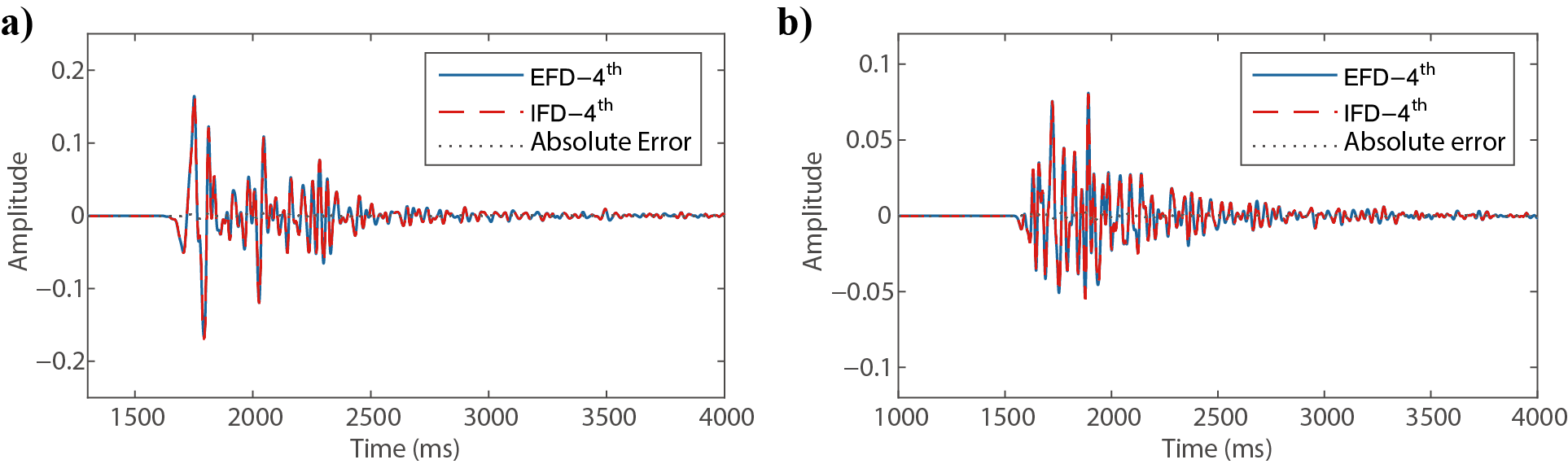 图4 Marmousi 模型中两个接收点(图2中“+”位置)接收到的波形。蓝实线代表显式 64 阶差分格式的结果,红虚线表示隐式隐式差分的结果,黑点线显示两者之间的绝对误差