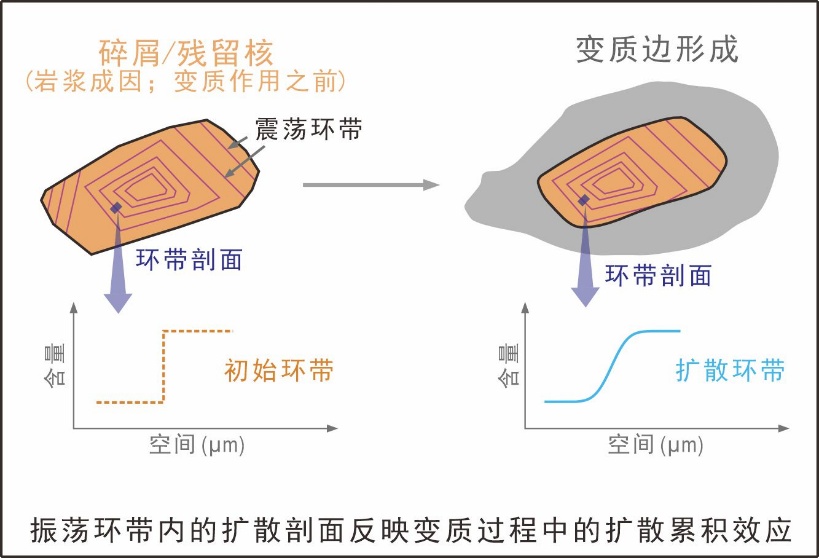 1 锆石扩散年代学的概念图,基于碎屑核/残留核内的震荡环带