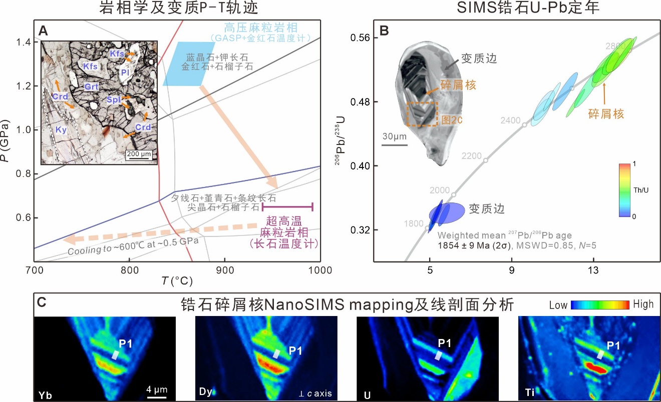 基于这一新方法,研究选取古元古代胶北麻粒岩地体中发育的典型且野外出露良好的超高温泥质麻粒岩为研究对象。通过综合相平衡模拟、传统温压计、NanoSIMS高分辨率元素成像以及自主研发的扩散模拟软件DIFFUSUP进行反演计算(图2),研究获得以下关键认识: