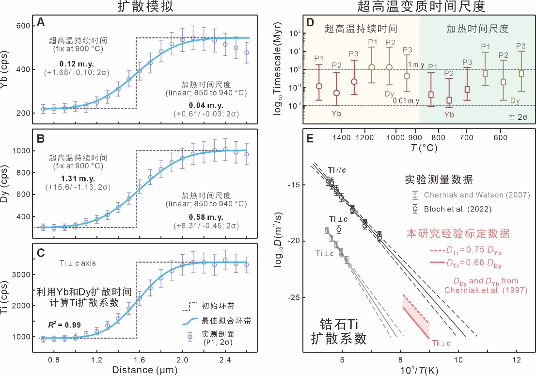3 A–C)在恒温900 ℃和从1.3 GPa850 ℃线性加热至0.65 GPa940 ℃开展的锆石YbDyTi扩散模拟限定超高温持续时间和加热时间尺度(P1实测剖面);(D)超高温持续时间和加热时间尺度汇总,P1P2P3为实测剖面;(E)实验测量的锆石Ti扩散系数和该研究的经验标定