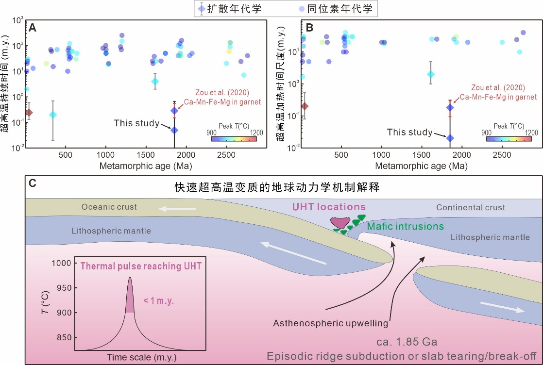 4 A–B)超高温持续时间和加热时间尺度随变质年龄的变化,基于扩散年代学和同位素年代学;(C)快速超高温变质的深部地球动力学机制解释