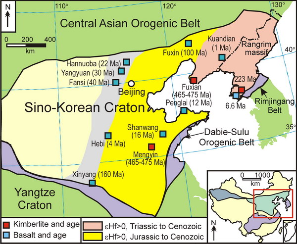 图1 中朝克拉通地幔包体分布图 克拉通(Craton)是由上部前寒武纪地壳和下部巨厚、冷的、耐熔的岩石圈地幔组成,自克拉通形成之后一般不会再有强烈的岩浆-构造活动和显著的大陆地壳的生长。然而,大量的地球物理和地球化学研究表明,中朝克拉通东部中国大陆之下的...