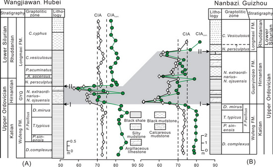 附图说明:扬子地块奥陶-志留系界线附近高分辨率化学蚀变指数(CIA)变化及对比   (A)宜昌王家湾剖面;(B)贵州桐梓南坝子(红花园附近)剖面。CIAcorr.代表校正的CIA指数(实圆心),垂直虚线代表平均页岩的CIA值范围,阴影段代表Hirnantian气候寒冷期,箭头指示...