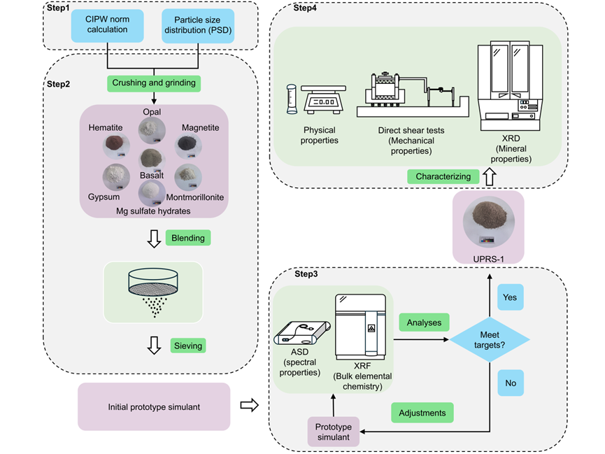 相比现有火星土壤模拟物,UPRS-1是首款针对火星乌托邦平原特殊地质背景研发的高仿真土壤模拟物。其独特的矿物组成(如含水硫酸盐)既能准确复现该区域受古外流通道沉积和潜在古海洋影响形成的表土特征,满足光谱分析和物性研究等科学需求,又可支持着陆器-土壤相互作用测试、钻探模拟等工程验证试验,同时为原位资源利用技术开发(如原位水资源利用)和火星宜居环境方面研究(如黏土矿物对微生物生存的影响)提供了理想实验材料。尤为重要的是,UPRS-1作为一种开放标准的模拟物,其矿物配方和粒径分布可随“天问三号”等未来任务获取的新探测数据持续优化,从而建立起动态更新的高精度模拟标准,该标准有助于提升模拟物对实际探测任务的支撑能力。