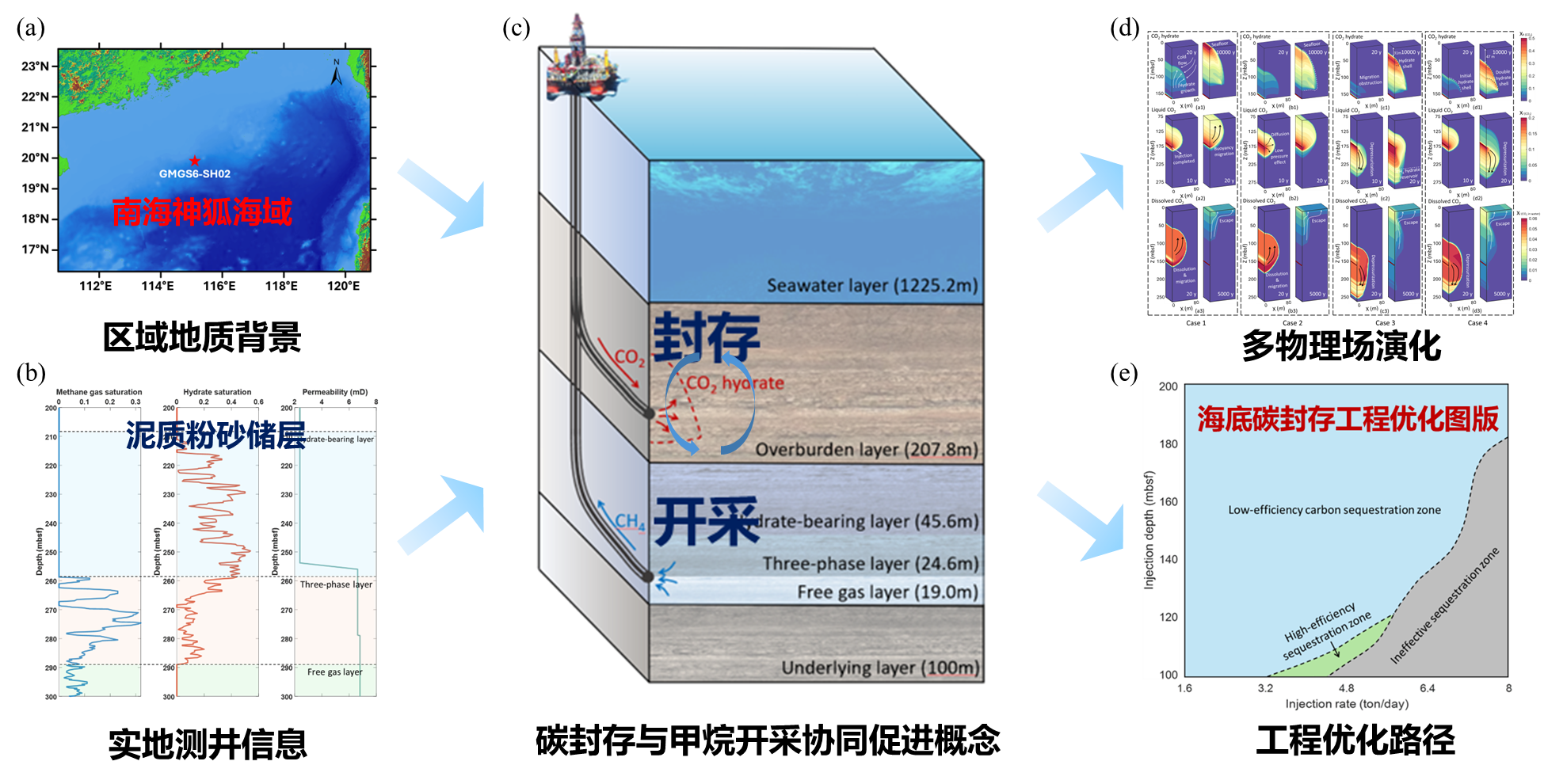 图1 (a)基于我国南海神狐海域为研究区;(b)现场实测泥质粉砂储层数据进行模型构建;(c)上部二氧化碳封存下部甲烷水合物开采的协同促进概念模型;(d)二氧化碳水合物、液态二氧化碳、溶解态二氧化碳等组分的多物理场演化;(e)海底二氧化碳水合物封存工程优化图版