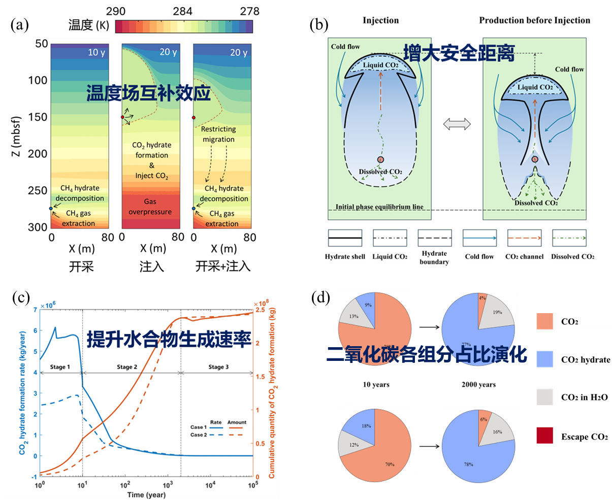图2 (a)二氧化碳封存与甲烷水合物开采的协同促进温度场互补效应;(b)直接封存二氧化碳与先开采甲烷后封存二氧化碳的水合物形态差异对比;(c)二氧化碳水合物生成速率对比;(d)二氧化碳各组分占比演化