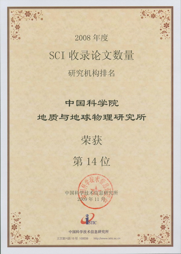 2008年度SCI收录论文数量在全国研究机构中排名第14位