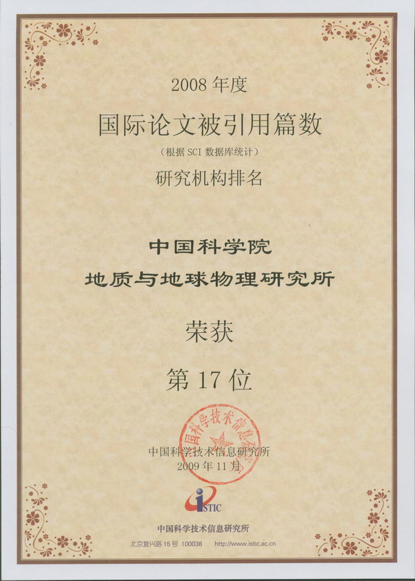 2008年度国际论文被引用篇数在全国科研机构中排名第17位