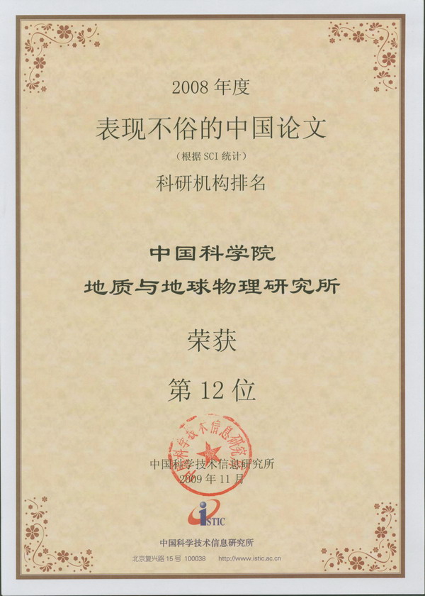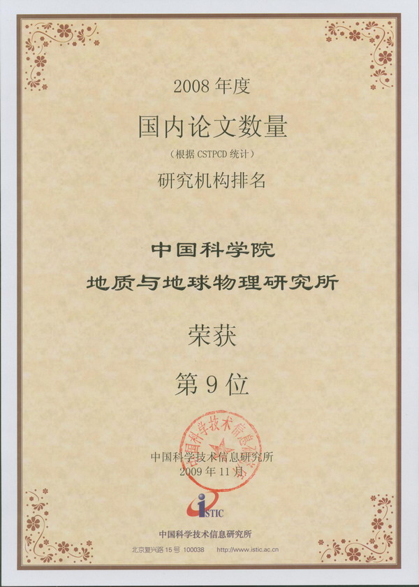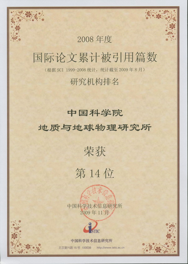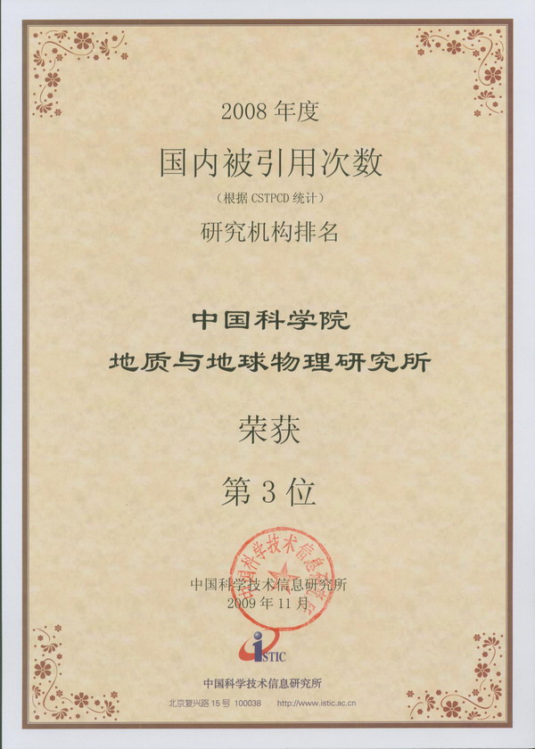 2008年度国内被引用次数在全国研究机构中排名第3位