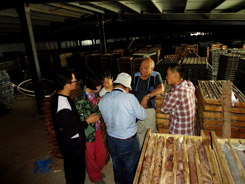 SEG地质与地球所学生分会成员在黑龙江岔路口斑岩Mo矿岩芯库中观察钻孔岩芯(右二为国际著名花岗岩矿床学家Shunso Ishihara教授)