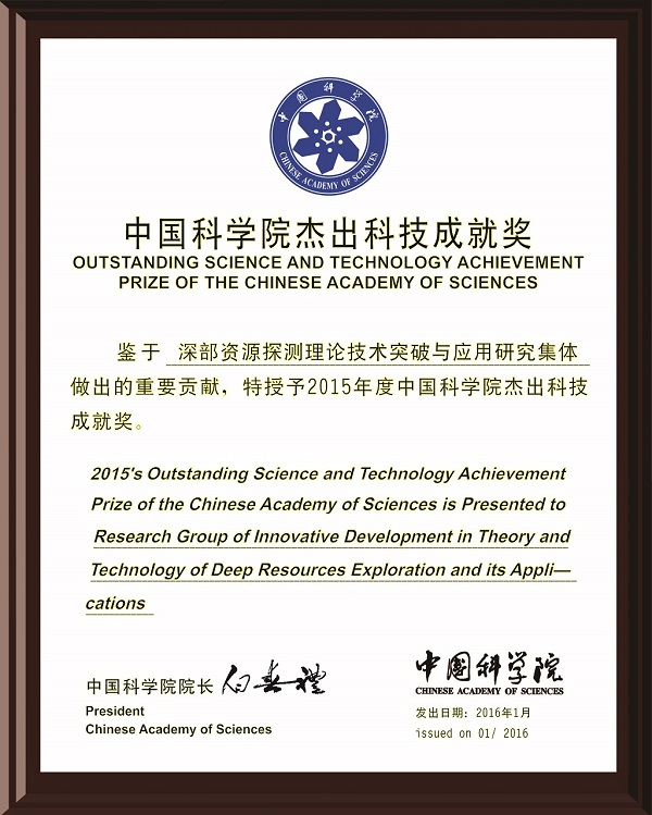 2016114日上午,2015年度中国科学院杰出科技成就奖颁奖仪式在中国科学院大学国际会议中心举行。我所底青云研究员、电子学所方广有研究员、我所薛国强研究员作为突出贡献者领衔的“深部资源探测理论技术突破与应用研究集体”荣获2015年度中国科学院杰出科技成就奖。中国科学院院长、党组书记白春礼院士为研究集体获奖代表底青云研究员颁奖。这是我所继“华北克拉通破坏研究集体”荣获2014年度中国科学院杰出科技成就奖后,再次获得该奖励。