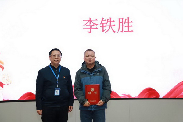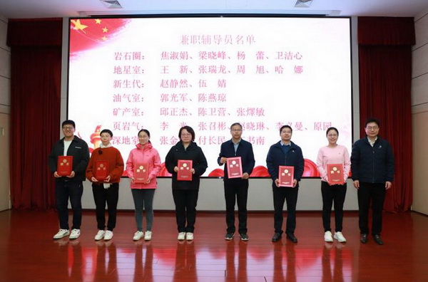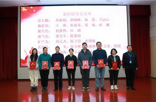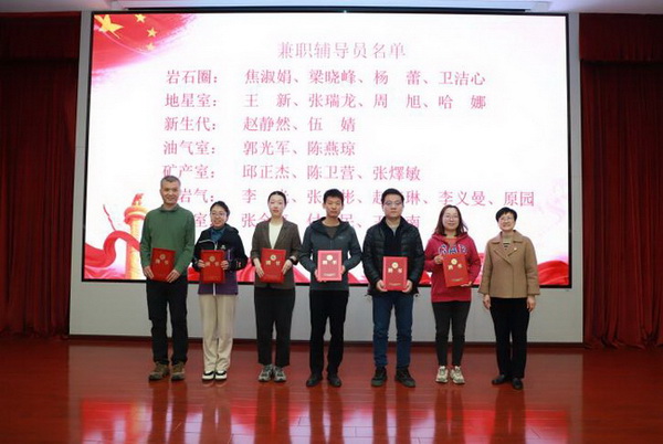 底青云、黄向阳、金德鹏分别为政治辅导员李铁胜及全体兼职辅导员颁发聘书。