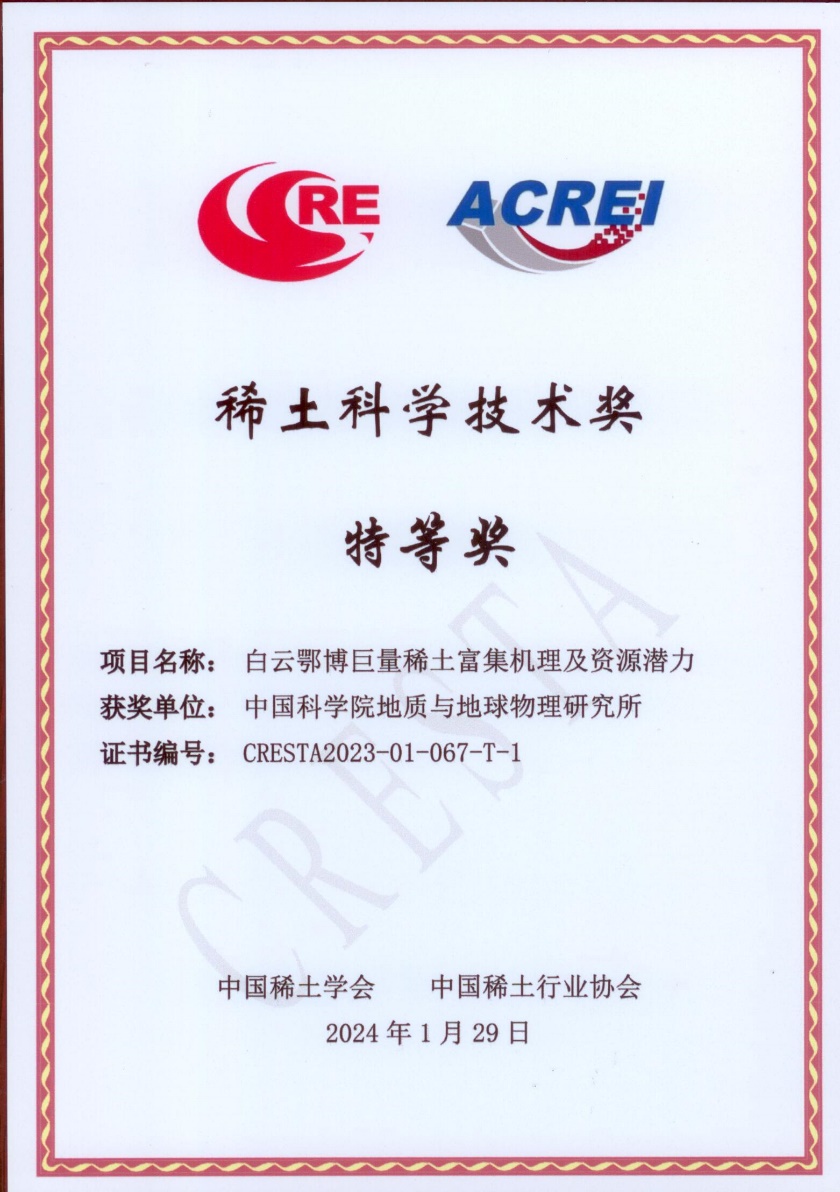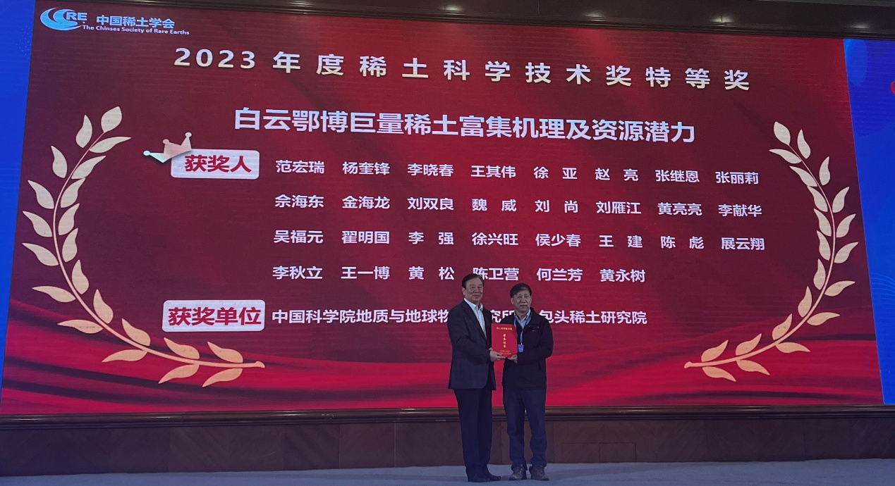 2024年10月25日至28日,由中国稀土学会主办的2024年学术年会在成都举行,开幕式上颁发了2023年度“稀土科学技术奖”,由我所和包头稀土研究院共同完成的“白云鄂博巨量稀土富集机理及资源潜力”项目获得特等奖,获奖者代表范宏瑞研究员上台领奖,并就获奖项目作做大会报告。