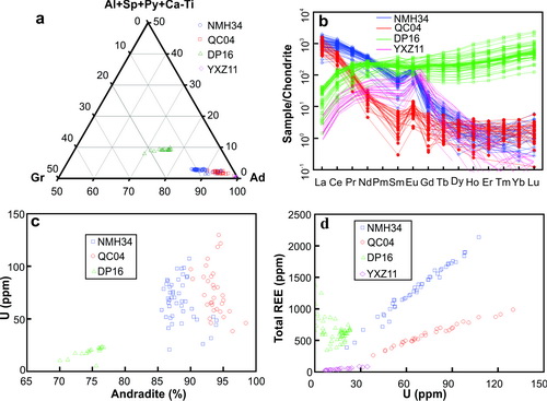 1 a)石榴石成分三角投图;(b)石榴石稀土元素球粒陨石标准配分图;(c)石榴石U和钙铁榴石成分相关性图;(d)石榴石U含量和稀土含量相关性图