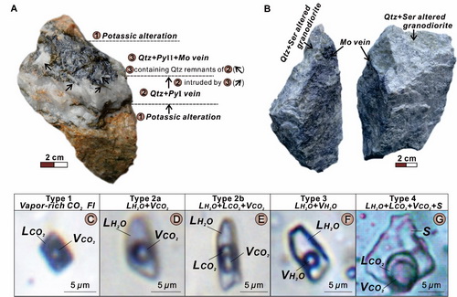 胶东半岛位于华北克拉通的东部,因其产出了一些世界级的金矿床而闻名。上庄金矿是其中典型的受构造控制的蚀变岩型金矿,金矿化以强烈的热液蚀变分带和穿插其中的矿化细网脉为特征。锆石U-Pb同位素定年显示其围岩郭家岭花岗闪长岩侵位时间为130 ± 1 Ma。矿物组合和岩相学分析显示上庄金矿的某些特征与典型蚀变岩型金矿有所区别,其中最主要的是金-多金属硫化物阶段辉钼矿的出现(图1A,B)和成矿早期发育含子晶流体包裹体(图1G),这些发现有助于更全面地理解胶东金矿床的成因。