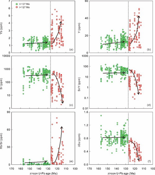 中科院广州地化所高昕宇博士和赵太平研究员系统对华北南缘中生代的岩浆作用及其与成矿的关系,近年来来开展了细致的研究工作,他们系统总结了前人研究资料,从岩浆岩的时空演变、岩石组合和地球化学特征等,探讨了花岗岩的物质来源及其形成的地球动力学机制。研究发现花岗质岩浆作用持续近50Ma,经历了2个阶段的演化,地球化学特征在127Ma前后有明显差异(图1)。早期阶段的花岗岩(158~128Ma)I型花岗岩,以不具有明显的Eu负异常、富集大离子亲石元素和亏损YYb等重稀土元素为特征。晚期花岗岩(126~112Ma),更富硅和钾,Eu负异常明显,具有更高的YYb含量和Rb/Sr比值,而SrδEuSr/Y比值等明显降低,具有较强分异演化的特征,均属于A型花岗岩或高分异I型花岗岩,SrNdHf同位素组成相对早期的更亏损(图2),并伴随少量基性岩浆岩的发育。由早到晚,幔源组分显著增多,认为华北克拉通南缘晚中生代构造体制由加厚的岩石圈向强烈伸展减薄的构造环境的转变,而127Ma前后是华北南缘晚中生代构造体制转变的一个关键时期(图3)。华北克拉通南缘晚中生代强烈的岩浆-成矿-构造热事件并不是扬子与华北克拉通碰撞后的产物,而是与古太平洋板块在亚洲大陆东部之下俯冲方向和速率的改变引发的整个中国东部构造转折、强烈壳幔作用、岩石圈伸展减薄有关。