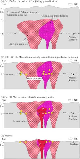 郭家岭花岗闪长岩黑云母40Ar/39Ar封闭年龄为124Ma(Li et al., 2003),表明从130Ma到124Ma经历了快速冷却过程,与快速抬升相对应。胶西北大量金矿床形成于126~119Ma (Yang and Zhou, 2001; Li et al., 2012),与郭家岭花岗闪长岩黑云母40Ar/39Ar封闭年龄相近或稍晚,表明金矿床是在花岗岩体快速隆升晚期或结束后构造背景下形成的,金矿床形成之后构造环境相对稳定,利于保存。