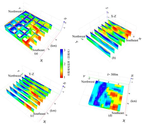 图2 三维反演电阻率模型切片:(a)反演模型垂向切片;(b)X-Z切片;(c)Y-Z切片;(d)Z=300m处X-Y切片