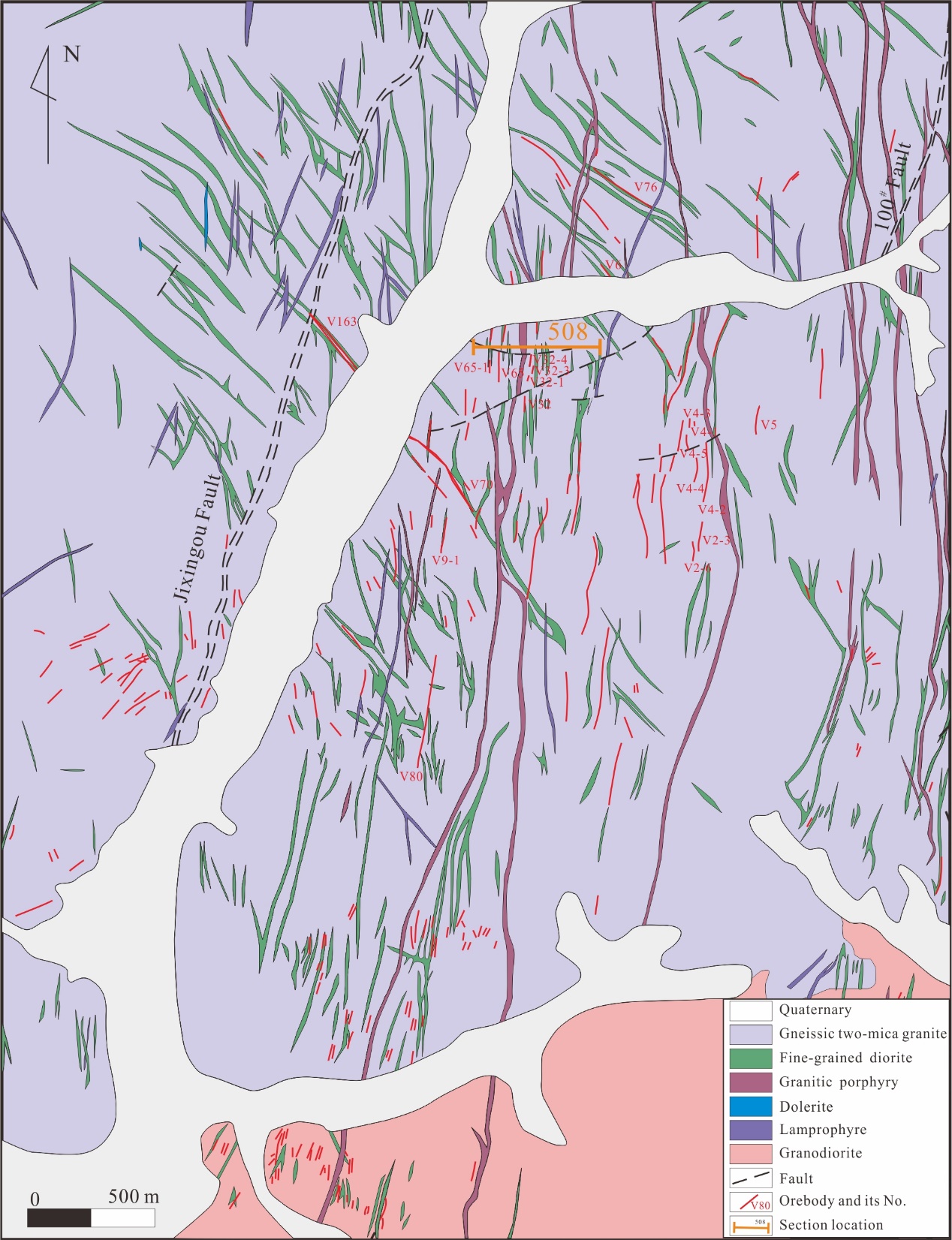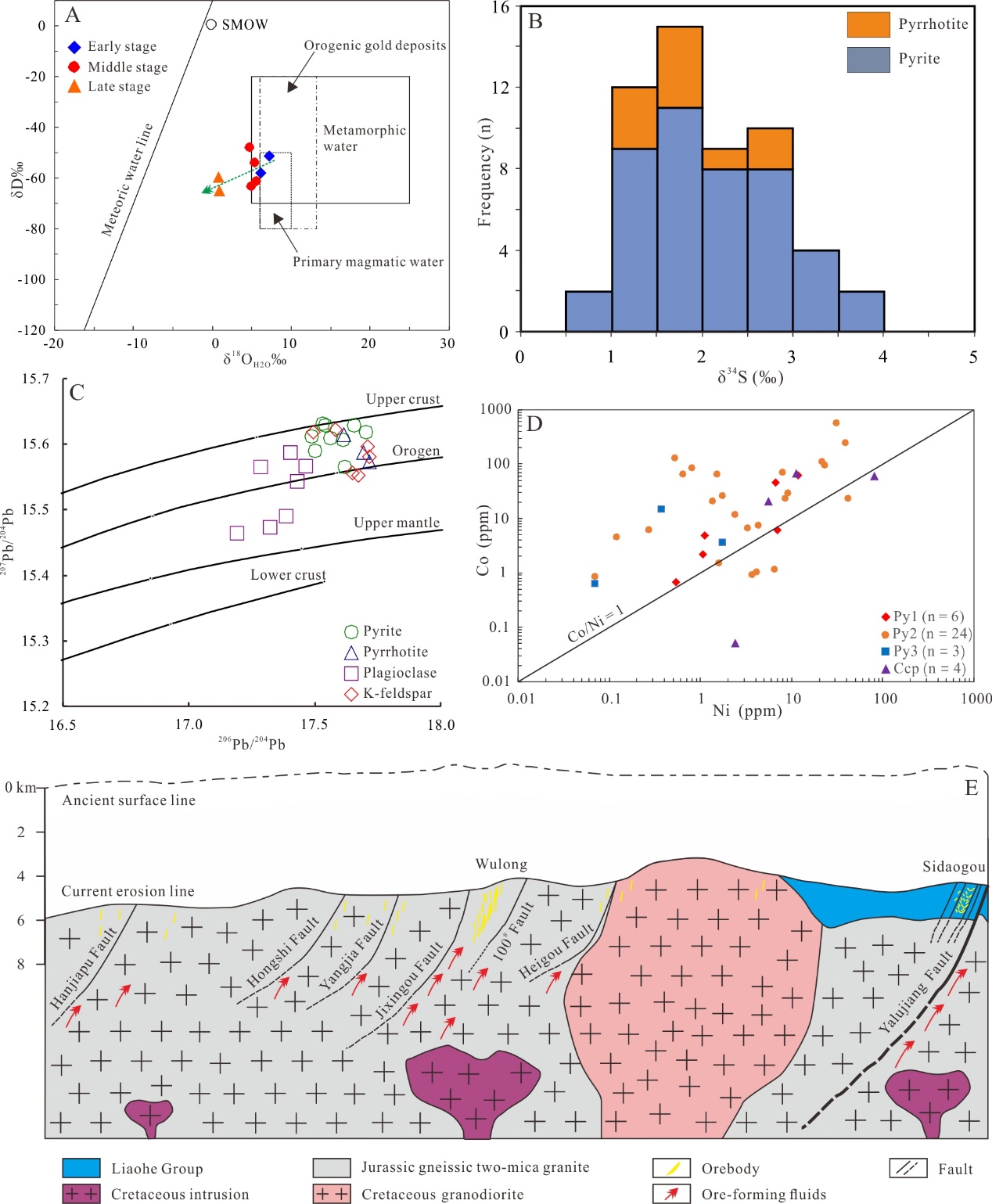 矿床围岩蚀变发育,主要蚀变类型有绢英岩化、硅化、绢云母化、绿泥石化和碳酸盐化等。根据矿物共生组合和穿插关系,五龙金矿床金矿化划分为3个阶段:早期石英±黄铁矿、中期石英-多金属硫化物及晚期石英-碳酸盐±黄铁矿阶段。流体包裹体研究表明金矿成矿流体为H2O-CO2-NaCl ± CH4 ± N2热液体系,流体不混溶作用是金沉淀的主要机制。不同成矿阶段石英H-O同位素表明成矿流体主要来源于岩浆水(图2A)。主成矿阶段硫化物S-Pb同位素表明成矿物质主要为岩浆源(图2B,C)。主成矿阶段黄铁矿(Py2)中的金浓度明显高于早阶段(Py1)和晚阶段(Py3),说明大量金沉淀主要发生在中期热液阶段。黄铁矿中高的Co/Ni比值表明其为热液成因(图2D)。在综合地质、成矿时代、成矿物质和成矿流体来源及性质、构造背景分析基础上,提出五龙金矿属于与侵入体有关的金矿床,成矿作用与早白垩世华北克拉通破坏密切相关,提出了辽东五龙金矿克拉通破坏成矿机制(图2E)。