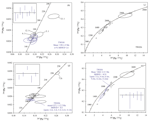 辽东半岛是华北克拉通东部地块的重要组成,中生代时期经历了由挤压造山向伸展减薄的大地构造环境转变导致了大规模岩浆活动和金成矿作用。在辽东半岛丹东地区,广泛出露一套酸性-中酸性侵入岩体,岩性以黑云母二长花岗岩和含二云母二长花岗岩为主。该岩体成岩期后受到较强的塑性变形,局部发生碎裂岩化和糜棱岩化,且岩体内含有较多辽河群变质岩残留体,前人曾称之为古元古代混合岩,属辽吉花岗岩一部分。本文在中生代五龙岩体中发现了古元古代侵入岩残留体,为了分析二者年代学、岩浆源区特征和成因联系进行了锆石SHRIMP U-Pb同位素定年和原位微区Lu-Hf同位素测试。结果显示:大面积的中生代侵入岩体结晶年龄为158±2Ma形成于晚侏罗世;锆石原位εHf (t)值为-29.3~-22.1二阶段Hf模式年龄tDM22606~3064Ma成岩物质来自太古代上地壳岩浆源区;而古元古代侵入岩残留体锆石具典型的核--边结构:锆石核部年龄范围为1851~2528MaεHf (t)值为-12.2~ +4.0,二阶段Hf模式年龄tDM22519~3437Ma反映核部继承锆石的多源性;幔部上交点年龄为(1862±13Ma,代表原岩结晶年龄,εHf (t)值为-11.9~ -2.2,二阶段Hf模式年龄tDM22644~3241Ma新生边谐和年龄为(157.1±2.2Ma,代表变质重结晶年龄,εHf (t)值为-30.8~ -26.1,二阶段Hf模式年龄tDM22852~3150Ma,均反映上地壳岩浆源区特征。研究认为,辽东半岛大面积侏罗纪五龙岩体是古元古代花岗岩受晚侏罗世~160Ma重熔作用,而原地重新结晶形成的岩体;部分未完全重熔而形成的残留体是华北克拉通东部北缘古元古代侵入岩于中生代拆沉-重熔的直接证据。