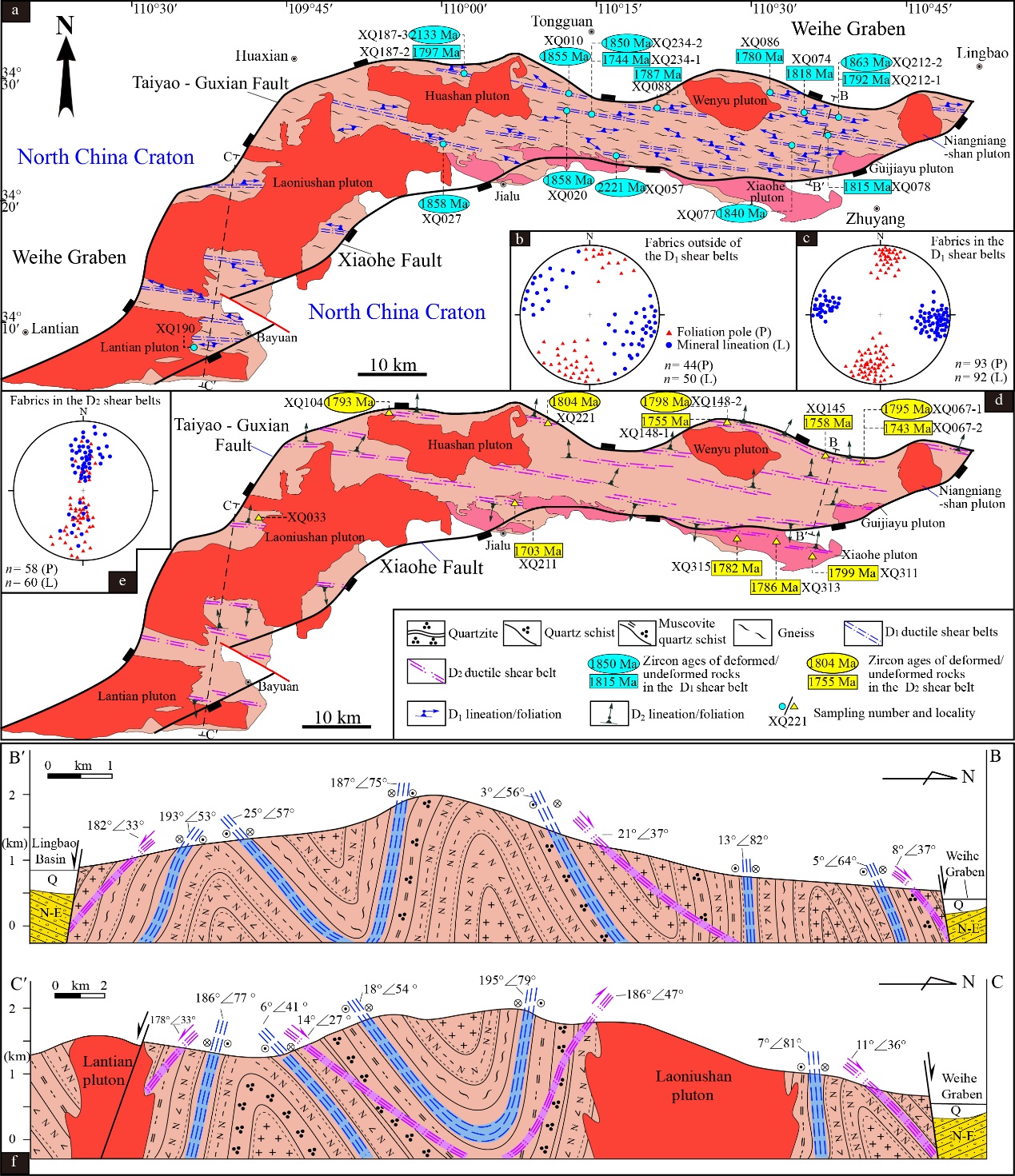注意到,太华杂岩变质基底发育的两期构造的主体走向为NWW-SEE,这与小秦岭地区大量NWW-SEE走向的金矿脉方位一致,这两期构造对于后期金成矿具有重要的控制作用,小秦岭地区前寒武纪构造演化对于金成矿起到至关重要的作用。
