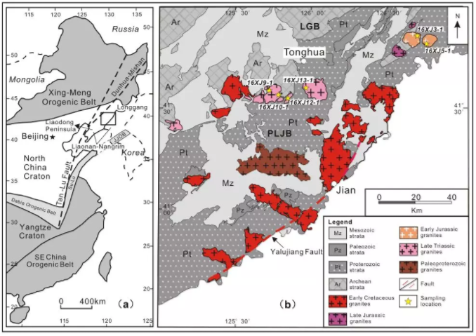 图1 (a)中国东部构造简图;(b)吉林省南部中生代花岗岩分布图及采样点