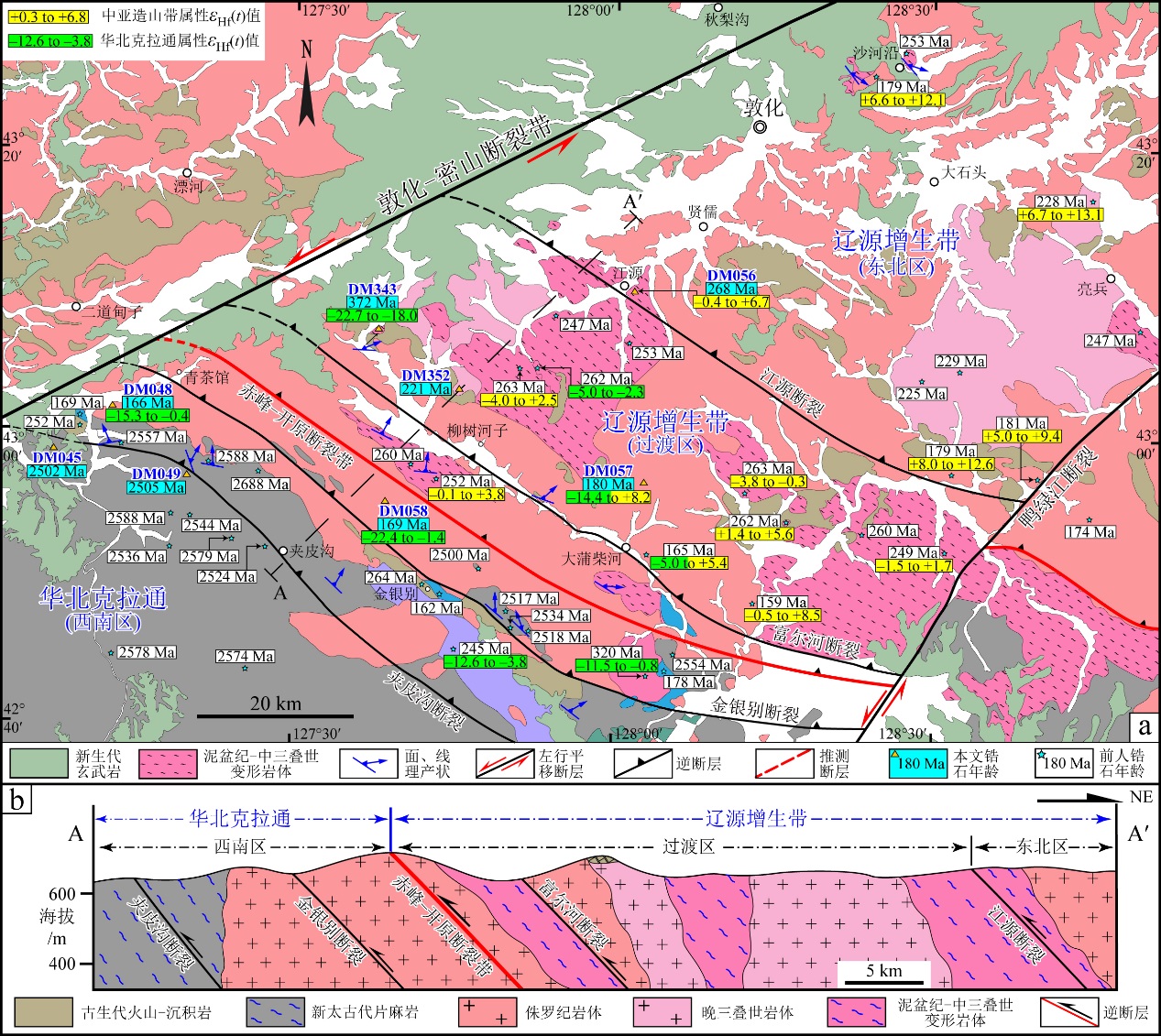郯庐断裂带北段在东北地区分为两条分支,东分支为敦化-密山断裂带(简称敦密断裂带),西分支为依兰-伊通断裂带。然而,敦密断裂带的左行平移位移量却长期还不确定,存在着不同的认识。华北克拉通与辽源增生带(处于中亚造山带南缘)之间的边界位置是限定敦密断裂带左行平移位移量的最佳场所(图1)。但是,由于大量后期岩浆岩的侵位与改造,使得这一地带边界位置一直无法确定。