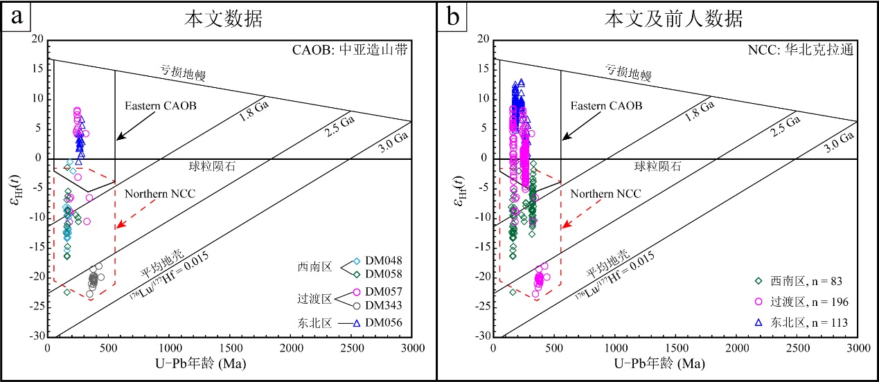 本文依据岩石类型、锆石年龄谱、εHf(t)值(图2)以及二阶Hf模式年龄的对比分析,共同指示了敦密断裂与鸭绿江断裂之间辽源增生带的存在以及具体位置(图1)。这些数据表明辽源增生带存在于敦密断裂东侧的过渡区和东北区,并且其与华北克拉通之间的精确位置沿赤峰-开原断裂带(本次工作确定的位置)展布。