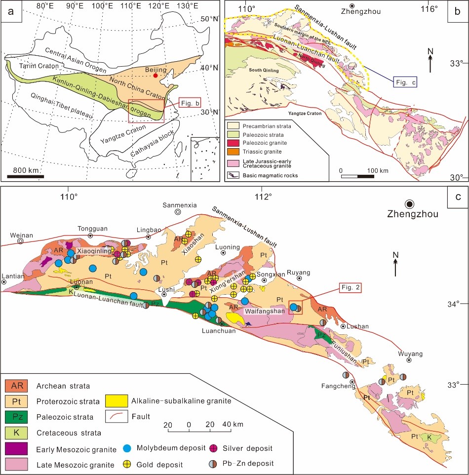 华北克拉通南缘以盛产钼资源而闻名于世,是世界上第一大钼矿带。随着地质找矿工作的深入,过去几十年在华北南缘又先后探明了一大批铅锌矿,使该地区成为华北重要的铅锌资源产地(图1)。对于这些铅锌矿与钼矿的之间成因关系,目前存在一些争论。一些学者认为铅锌矿是斑岩钼矿远端的产物,为同一期岩浆-热液产物;而另一部分研究认为这些铅锌矿形成于大陆碰撞机制下,成矿流体来自于地层的变质脱水;还有少部分观点认为这些铅锌矿为MVT或SEDEX型矿床。