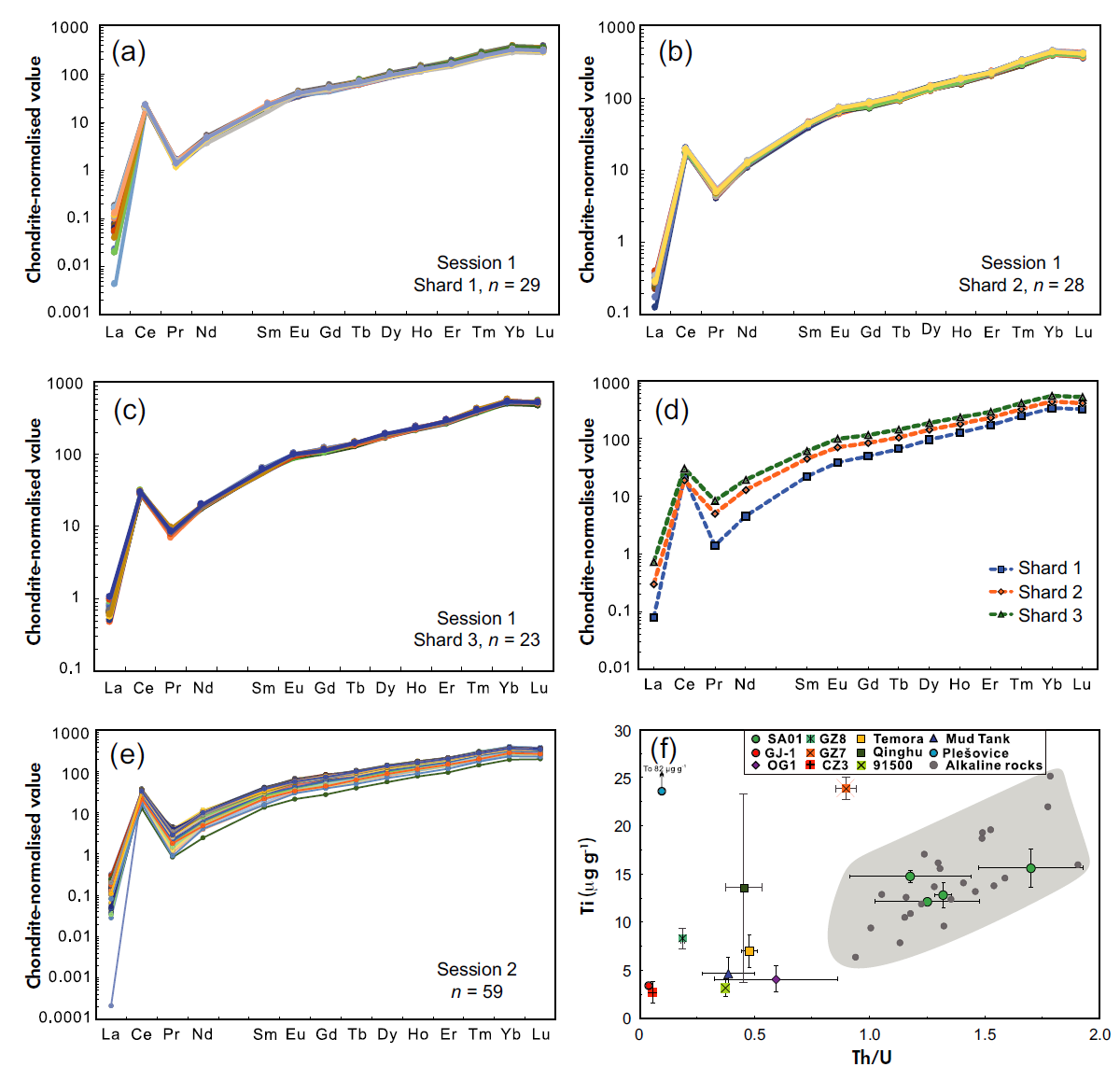 SA01锆石的激光微区微量元素分析显示其Hf含量为9797 ± 563 μg g-1 (1s, n=139), U含量为161 ± 50 μg g-1 (1s, n=139), Th含量为243 ± 126 μg g-1 (1s, n=139),Th/U为1.44 ± 0.32。Ti的含量分布从10.1μg g-1到19.7μg g-1,对应的温度范围是742-804 °C。与广泛应用的其他锆石标准物质相比,SA01具有较高的Ti含量和Th/U比,如图3所示,这表明锆石SA01可能结晶自于碱性岩浆。先前的研究表明,除了放射性损伤外,锆石晶格中微量元素的替代也会影响激光剥蚀速率,进而导致分析样品和标准物质之间出现年龄的系统偏差。因此,在对碱性岩中锆石进行U-Pb年龄的激光微区分析时,SA01锆石是最为理想的标准物质。