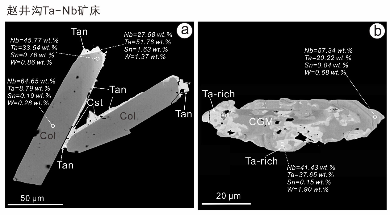 图2铌钽铁矿的BSE图像. (a)铌钽铁矿(CGM)中铌铁矿(Col)具有微弱同心环带,边部发育钽铁矿(Tan)和钽锡石(Cst);(b)铌钽铁矿局部保留明显的震荡环带,大部分被钽铁矿交代形成斑杂状结构.