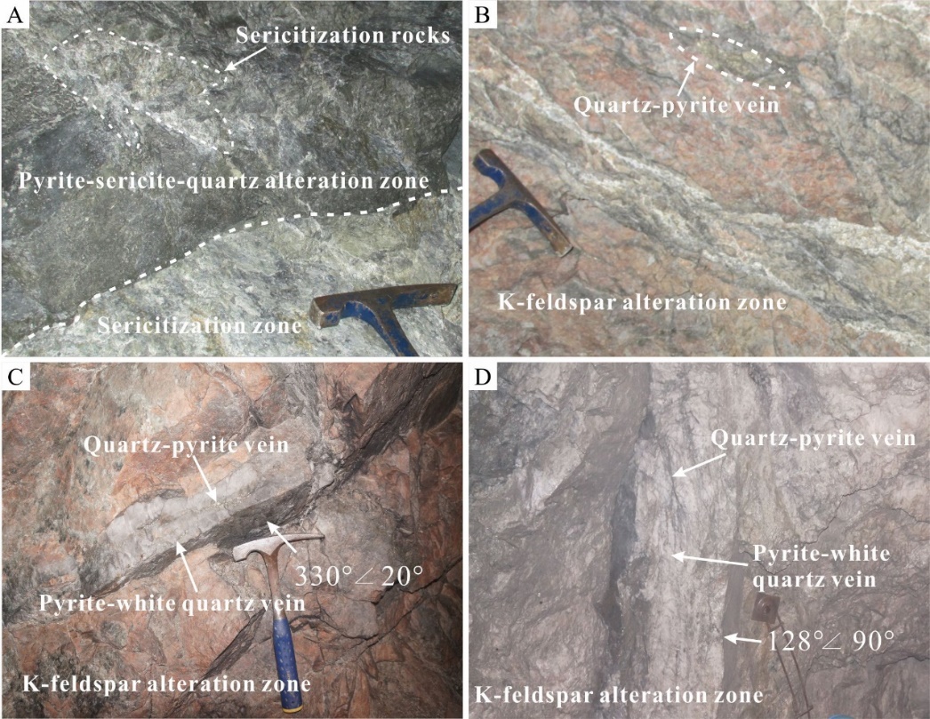 图1 焦家金矿围岩蚀变、矿化照片