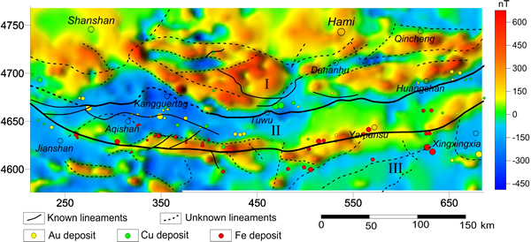 图2 东天山航磁异常、断裂构造及典型矿床分布