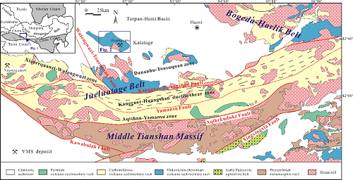 火山成因块状硫化物(VMS)矿床是世界上铜、铅、锌、银、金等的重要来源。在中亚造山带,VMS矿床主要集中在新疆阿尔泰山南缘的火山-沉积盆地中,且均为晚古生代成矿。相比之下,新疆东天山地区发育的VMS型矿床很少,具有代表性的为卡拉塔格成矿带上赋存在早古生代地层中的黄土坡铜锌矿(图1)。