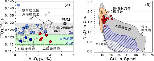 图1. (A) 天山蛇绿岩地幔橄榄岩Os同位素特征; (B)二辉橄榄岩的矿物成分