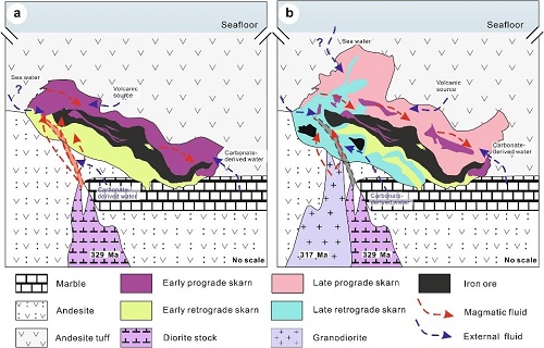 在国家深地资源项目(编号为2017YFC0601201)等资助下,杨富全课题组对成矿带内的查岗诺尔铁矿开展了锆石U-Pb年代学、岩石地球化学以及稳定同位素的研究。结果表明查岗诺尔铁矿床发育两期与铁矿化有关的矽卡岩蚀变,有关闪长岩和花岗闪长岩的锆石U-Pb年龄分别为329±2 Ma317±4 Ma;岩体具有高钾-钾玄质、准铝质的特征,具有明显的NbTaTiSr负异常。