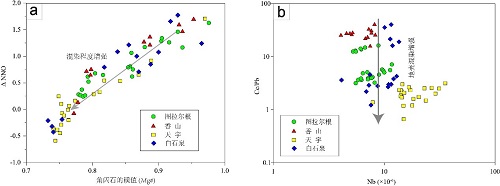 图2. (a)图拉尔根、香山、天宇和白石泉矿床角闪石计算的岩浆氧逸度(△NNO)和角闪石镁值 (Mg#) 相关性图;(b)角闪石中Nb和Ce/Pb比值的相关性图