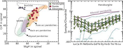 图1.(A)唐巴勒蛇绿岩中橄榄岩与豆荚状铬铁矿中铬尖晶石的地球化学特征;(B)唐巴勒蛇绿岩中方辉橄榄岩的稀土配分模式