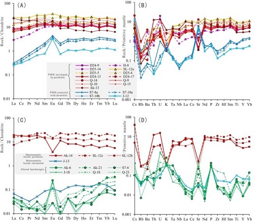 图1 PMM、交代岩及橄榄岩的稀土配分图(A、C)和微量元素蛛网图(B、D)