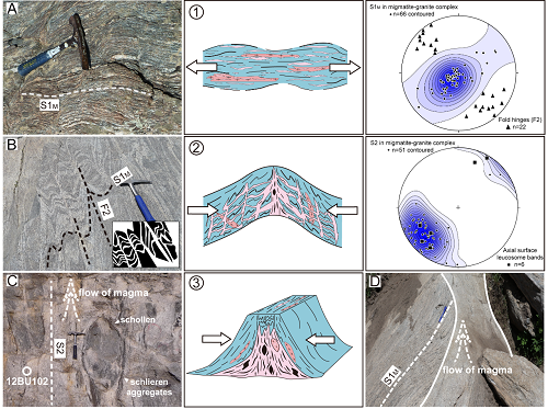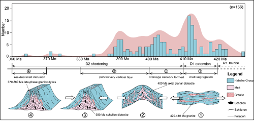- 定年结果显示早期地壳深熔作用及熔体析出发生在距今420-410 Ma(百万年前),晚期熔体汇聚流动过程分为三个阶段:410-100 Ma 构造应力由伸展转换为挤压,熔体开始向挤压褶皱轴部富集并形成网状的熔体迁移通道;400-380 Ma 熔体在褶皱轴面通道大量汇聚,造成深熔地壳显著的向上流动,其后在浅部地壳形成花岗岩-混合岩穹隆;370-360 Ma 冷凝阶段,残余熔体以脉体的形式侵入到冷却的围岩中(图3)。