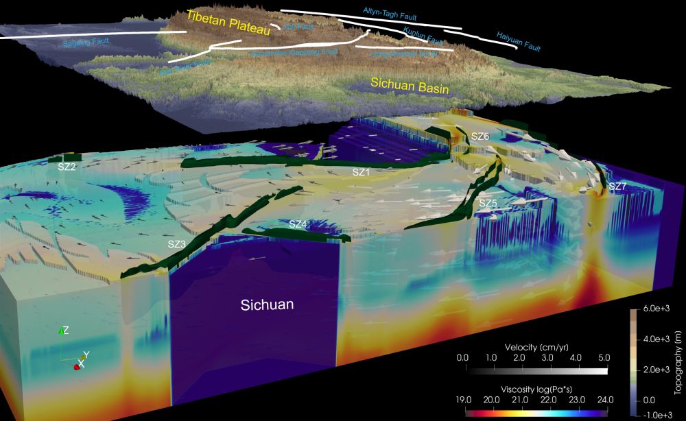 在国家自然科学基金委“大陆演化与季风系统演变”基础科学中心项目与“特提斯地球动力系统”重大研究计划等的资助下,800彩票岩石圈演化国家重点实验室杨建锋博士(目前是意大利帕多瓦大学博士后)联合地震学、构造地质学团队开展了动力学数值模拟实验研究。他们应用三维高分辨率的粘-弹-塑性热力学模型,模拟了喜马拉雅-青藏高原造山过程中大型走滑断层的形成机制。研究发现,一个强的上地壳(粘度>1022 Pa·s)和一个中等弱的中下地壳(粘度~1020 Pa·s)可以模拟得到与青藏高原地区类似的大型走滑断层(图2,图3)。他们的模型结果显示,在断层下方同时形成了上升的下地壳流,与观测的地震波低速区及高电导率区存在对应关系。上涌的下地壳表明这些剪切带可能主要受张扭和压扭控制。系统性的参数测试发现,下地壳流和青藏周缘的坚硬块体都能促进走滑断层的发育,而先存的软弱带(如缝合带)不是必要条件。