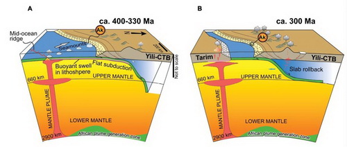 进一步对天山地区及塔里木大火成岩省内的洋岛玄武岩的进行Pb同位素分析,发现它们与非洲地幔柱区域(Tuzo)的洋岛型玄武岩更为类似,具有更高的Th/U比值,与太平洋区域的洋岛玄武岩略有差异。而这一结果也和前人的绝对板块位置重构结果类似,认为南天山洋在古生代可能位于非洲地幔域上方(图3)。