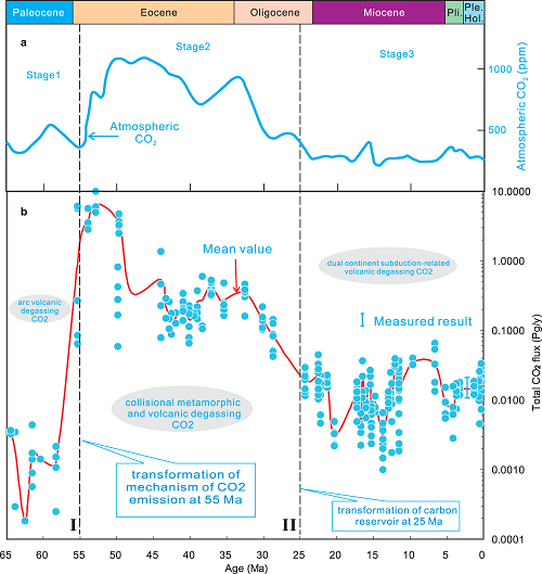新生代以来全球气候变冷是地球科学领域广泛关注的焦点问题之一,被认为与大气CO2浓度降低有密切的联系。青藏高原隆升及其相关的深部-表层相互作用在新生代气候转型过程中起着重要的作用,然而关于印度与亚洲大陆汇聚、碰撞、俯冲过程与新生代大气CO2浓度变化的具体作用机制仍存在很大的争议。一种观点认为,青藏高原隆升导致地表硅酸盐风化作用增强,加速消耗大气圈中的CO2,从而造成大气圈CO2浓度降低;另一种观点认为,随着印度与欧亚大陆的碰撞,导致新特提斯洋关闭,最终使得大洋板片俯冲脱碳作用停止,造成深部碳释放速率降低。青藏高原新生代岩浆活动与变质作用完整记录了陆-陆碰撞和大陆俯冲的演变过程,同时它们也是深部碳循环的主要载体,为研究上述的科学问题提供了重要材料。尽管前人也开展了探索与研究,但大多针对新生代典型气候事件(例如,PETM,EECO等)的形成机制与成因等,而缺乏新生代以来地质源(包括构造、岩浆与变质作用等)温室气体释放规模连续的研究记录。 近日,800彩票新生代地质与环境重点实验室郭正府研究员、刘嘉麒院士与英国利兹大学、德国慕尼黑大学的合作者,在以往研究(郭正府等-Geology:渐新世-中新世之交:青藏高原隆升过程中岩浆活动的转型)的基础上,系统分析和总结了印度-亚洲大陆碰撞的深部地球动力学过程和青藏高原新生代岩浆活动历史,重建了65 Ma以来岩浆-变质作用深部碳释放通量的演化曲线,并探讨了与新生代大气CO2浓度变化的关系,为上述这一焦点问题的深入理解提供了新的研究视角。 青藏高原新生代岩浆活动的三阶段演化及其与大气CO2浓度变化的耦合关系 新生代青藏高原的岩浆活动规模巨大,从早到晚,呈现出接近连续的岩浆活动与演化特征。自65Ma以来,青藏高原新生代的构造-岩浆活动可以划分为如下三个演化阶段(图1):