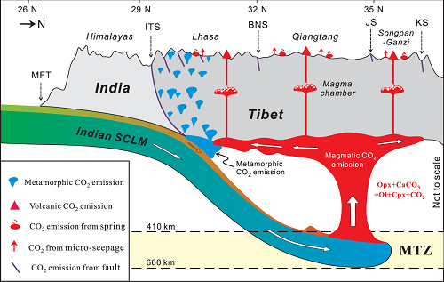 图3 印度-亚洲大陆碰撞造山带的CO2释放类型,主要包括变质作用和岩浆活动的碳释放两种类型。其中,岩浆活动碳释放类型包括:火山喷发期的碳释放及休眠期温泉水热系统、断裂带和土壤微渗漏。 前人利用岩浆包裹体估算深部碳释放通量的方法,不仅存在较大的误差,且难以获得连续的高精度结果,本研究开发了一种利用岩石地球化学参数结合深部动力学过程重建构造-岩浆活动碳释放通量的模型(CCFM),建立了新生代以来地球深部释放温室气体通量的时间演化序列,探索了65 Ma至今青藏高原深部碳循环与全球大气圈温室气体以及气候变化之间的内在联系。我们也期待着在未来的相关研究工作中该模型能够进一步发挥其潜力,试图将固体地球科学与古气候学的研究有机地结合起来,进一步打通利用岩石地球化学等手段开展古气候学研究的科学障碍,为深入开展地球深时的古气候变化提供新的研究思路与途径。本研究的合作单位之一德国慕尼黑大学地球和环境科学系在官网上评述,认为“文章为理解新生代大气CO2浓度变化与印度-亚洲大陆碰撞、造山的关系提供了高精度的岩浆-变质活动碳释放记录”,详细内容请见(https://www.mineralogie.geowissenschaften.uni-muenchen.de/aktuelles/india_asia_collision/index.html)。 该成果发表在国际权威学术期刊Nature Communications上(郭正府, Marjorie Wilson, Donald B. Dingwell, 刘嘉麒. India-Asia collision as a driver of atmospheric CO2 in the Cenozoic. Nature Communications, 2021, 12, 3891. DOI: 10.1038/s41467-021-23772-y)。本研究成果受中国科学院、国家自然科学基金及科技部项目的联合资助。