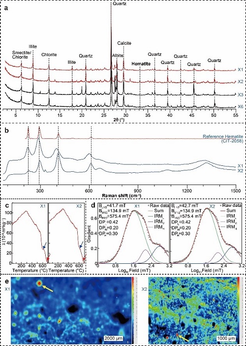 图2 赤铁矿加工相关遗迹(红色染色区)与遗物。A, 相关遗物和遗迹的原始状态;B, 赤铁矿粉末染色区;C, 表面可观察到摩擦痕的赤铁矿;D, 赤铁矿小块;E, 表面染色并残留赤铁矿微屑的加工工具(石灰岩板)。(研究团队提供) 下马碑遗址中的赤铁矿加工遗存的确定是研究工作的重点。首先通过拉曼光谱(Raman)、X射线荧光光谱(XRF)和扫描电镜能谱(SEM-EDS)分析,确定野外发掘中疑似颜料加工区内含有两块大小不同、矿物成分亦有差异的赤铁矿(赭石)小块。显微分析揭示出其中较大一块表面有明显的反复摩擦痕迹。随后对伴生的另一块表面明显被染红的长条形石灰岩进行分析,发现在其表面残留有赤铁矿微屑,大小200mm左右,犹如发丝。颜料加工区内另一件遗物为一件表面部分磨光的卵石,虽无明显的残留物,但其部分明显磨光的特征说明可能作为磨锤或杵使用。为了进一步明确染色区域是由人为因素产生而非自然形成,对染色区、遗址内其他区域及遗址外不同区域的沉积物进行了多指标综合分析,包括X射线衍射(XRD)、微束X射线荧光光谱(microXRF)、拉曼光谱(Raman)、扫描电镜能谱(SEM-EDS)和岩石磁学等,多种手段的分析结果一致显示,仅染色区富集赤铁矿,其他区域并不含有赤铁矿(图3)。此次在下马碑遗址发现的赤铁矿加工遗存是东亚地区首次正式见诸报道的此类发现,将东亚早期人类使用颜料的历史提早到距今4万年前,也使东方古人类艺术创作、审美、认知表达的历史大大提前,改写了学术界的认识。