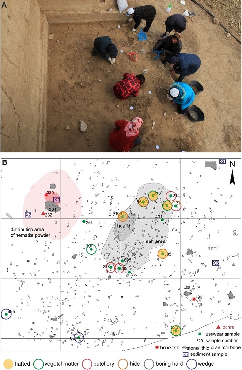 图5 遗址位置、周边景观及地层. A,遗址野外发掘照;B.遗迹、遗物平面分布情况(含石器功能信息) (研究团队提供) 距今4万年是旧石器时代晚期革命和早期现代人群形成、扩散与行为现代化的关键节点。来自田园洞的人类化石和分子生物学证据证实,在距今4万年前后,现代人已经在华北地区活动,但我们对他们的行为和文化知之甚少。此次对下马碑遗址所蕴含的人类行为信息的全方位提取,对于解读东亚现代人演化具有极为重要的价值,并有助于深入理解现代人演化研究这一全球性科学问题。下马碑遗址揭示了东亚现代人复杂的文化演进过程,与欧亚大陆西部人群的技术与文化发展同步,且很可能与其他人群(例如丹尼索瓦人)存在文化与基因交流,反映了局地的马赛克式的“文化与技术革新”。下马碑遗址揭示出的这种文化面貌的特殊性既与以往认为的连续性的文化演进不同,亦有别于普遍被认知的现代人在欧亚大陆扩散的文化模式。 本次研究工作中的国际化、跨学科、多平台协作凸显了人类演化领域科学研究发展的趋势和要求。对全球性关键科学问题的探究中,人类作为命运共同体协同配合关注自身发展演化的历史。 成果发表于Nature(王法刚, 杨石霞, 葛俊逸, Andreu Olle?, 赵克良, 岳建平, Daniela Eugenia Rosso, Katerina Douka, 关莹, 李文艳, 杨海勇, 刘连强, 谢飞, 郭正堂, 朱日祥, 邓成龙, Francesco d’Errico, Michael Petraglia, Innovative ochre processing and tool use in China 40,000 years ago, 2022, https://doi.org/10.1038/s41586-022-04445-2),本次研究工作得到了国家文物局、河北省文物局、中国科学院、科学技术部、国家自然科学基金委员会、中国科学院青年创新促进会、德国马普学会、法国波尔多大学和西班牙IPHES等部门和研究机构的大力支持和资助。