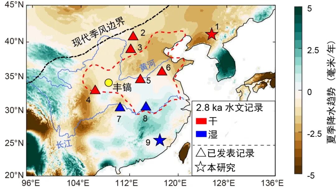 气候变化对文明的影响是全球关注的热点科学问题。西周(公元前1045–771年)是中国古代重要的统一王朝,奠定了中华文明的基础,被誉为“文明的黄金时代”。然而,在统治274年后,西周于公元前771年灭亡,并引发社会动荡和人口迁移。研究中国西周的兴衰,可以为当前气候挑战提供借鉴。 以往研究多将西周灭亡归因于军事、政治或经济矛盾,忽视了气候变化的影响。由于东亚季风区缺乏高精度古气候记录,难以将气候变化与西周历史进行有效对比,从而无法判断气候波动是否显著影响了其覆亡及人口的迁移。