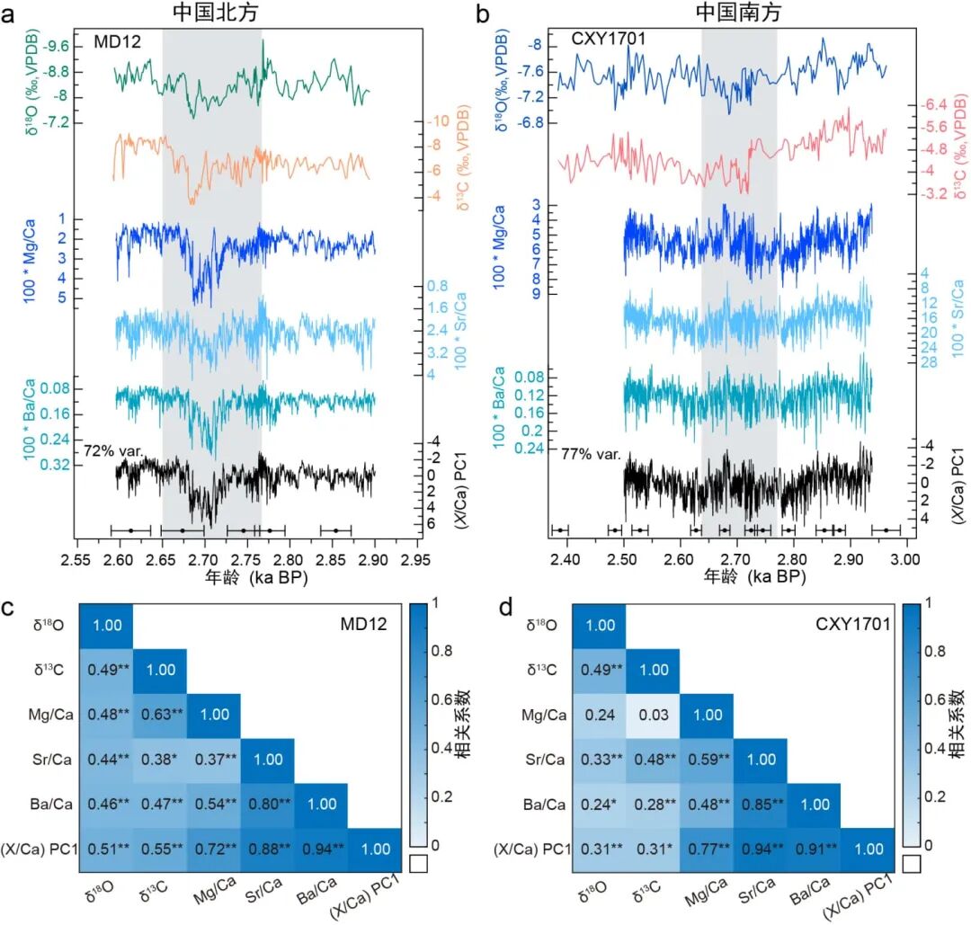 图1. 本文提到的水文指标记录点的位置。1—庙洞(本研究),2—岱海湖,3—公海湖,4—祥龙洞,5—河南圃田湖相沉积岩芯,6—梁儿村考古遗址,7—和尚洞,8—江汉平原JH001沉积岩芯,9—仙云洞(本研究)。黄色圆圈表示西周的首都丰镐。红色虚线代表西周控制的最大面积。背景是1950—2010年夏季(6—9月)降水趋势。 围绕上述问题,800彩票岩石圈演化与环境演变全国重点实验室环境演变与碳循环学科中心李苗发博士后、旺罗副研究员、郝青振研究员,与福建师范大学蔡炳贵教授等多家单位的学者合作,利用我国东北与东南两地两个年代约束精确、覆盖2.95—2.50 ka BP的多指标(稳定同位素与微量元素)石笋记录(图1和2),结合其他古气候与考古证据,重建了2.8 ka事件前后中国季风区的大气环流与区域水文变化,并基于遗址点14C测年数据的空间密度探讨了该气候事件对西周相关人口迁移的影响。