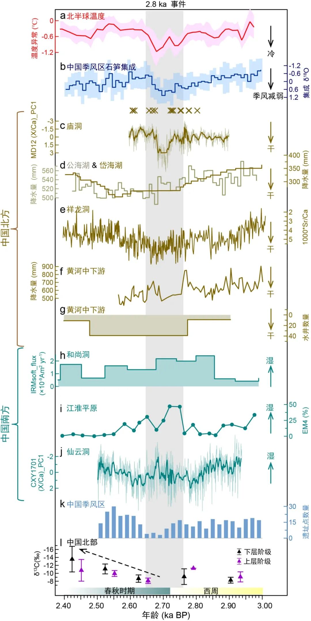 图3. 北半球温度、集成石笋δ18O、水文指标记录和考古资料的对比。a,北半球温度异常记录。b,中国季风区石笋δ18O记录集成。c,庙洞石笋MD12微量元素记录的PC1(本研究)。d,公海湖和岱海湖花粉重建的降水。e,祥龙洞石笋XL16的Sr/Ca记录。f,黄河中下游圃田湖相沉积物花粉降水重建。g,黄河中下游地区水井数量。h,和尚洞石笋HS4的环境磁参数IRMsoft_通量。i,江汉平原JH001沉积岩芯的粒度端元组分EM4,反映古洪水。j,石笋CXY1701微量元素记录PC1(本研究)。k,中国季风区考古遗址数量。l,中国北方不同考古遗址的社会经济地位上、下层人骨的δ13C数据。“×”代表历史文献中记录的干旱事件。灰色阴影表示2.8 ka事件。